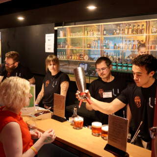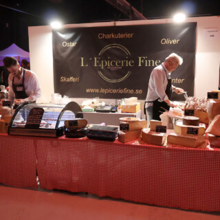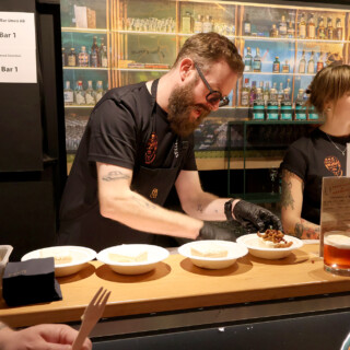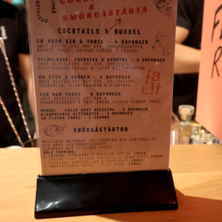 Heti tapahtumasalin sisäänkäynnin vasemmalla puolella näin RomRobbanin seisovan kojullaan ja koska kojulla ei vielä ollut porukkaa, astelin esiin, esittäydyin (ruotsiksi tietenkin) ja rupattelin tovin mukavia Robbanin kanssa rommista ja kaikenlaisesta tähän yhteiseen harrastukseemme liittyvästä. Tai no, hänellehän rommi on ammatti. Tämän jälkeen siirryimme seuraavalle kojulle, jossa seisoi Emil Åreng. Myönnän, että tässä vaiheessa koin jotain, jota en ole aiemmin elämässäni oikeastaan kokenut. Tunne on englanniksi nimeltään star struck ja se tarkoittaa sitä tilannetta, kun tapaat henkilön (tähden) jota fanitat ja huomaat sen vaikuttavan itseesi siten, että sekoilet melkein sanoissasi ja olet hieman hämilläsi. Menin kuitenkin esittäytymään ja sain juteltua Emilinkin kanssa hyvän tovin (edelleen ruotsiksi) ennen kuin tajusin päästää hänet takaisin työnsä pariin. Hän tarjoili ja valmisti kojullaan voileipäkakkuannoksia, joita hänen johtama baari/ravintola Facit myös tarjoilee ja joista on kuuluisa. Hänellä oli kojulla kolme työntekijää valmistamassa drinkkejä.