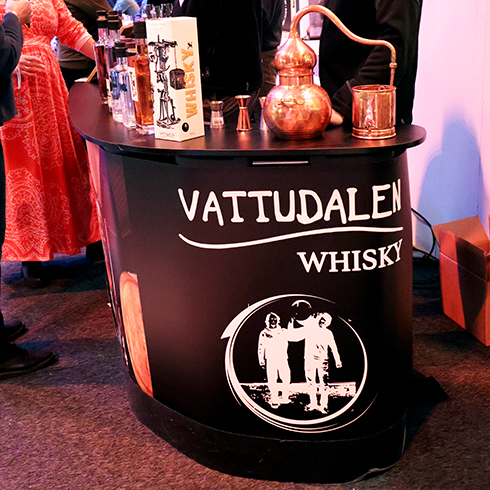 Heti tapahtumasalin sisäänkäynnin vasemmalla puolella näin RomRobbanin seisovan kojullaan ja koska kojulla ei vielä ollut porukkaa, astelin esiin, esittäydyin (ruotsiksi tietenkin) ja rupattelin tovin mukavia Robbanin kanssa rommista ja kaikenlaisesta tähän yhteiseen harrastukseemme liittyvästä. Tai no, hänellehän rommi on ammatti. Tämän jälkeen siirryimme seuraavalle kojulle, jossa seisoi Emil Åreng. Myönnän, että tässä vaiheessa koin jotain, jota en ole aiemmin elämässäni oikeastaan kokenut. Tunne on englanniksi nimeltään star struck ja se tarkoittaa sitä tilannetta, kun tapaat henkilön (tähden) jota fanitat ja huomaat sen vaikuttavan itseesi siten, että sekoilet melkein sanoissasi ja olet hieman hämilläsi. Menin kuitenkin esittäytymään ja sain juteltua Emilinkin kanssa hyvän tovin (edelleen ruotsiksi) ennen kuin tajusin päästää hänet takaisin työnsä pariin. Hän tarjoili ja valmisti kojullaan voileipäkakkuannoksia, joita hänen johtama baari/ravintola Facit myös tarjoilee ja joista on kuuluisa. Hänellä oli kojulla kolme työntekijää valmistamassa drinkkejä.